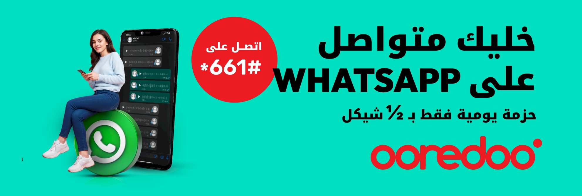 الآن من Ooredoo أقوى وأوفر حزمة 3G يومية مخصصة لتطبيق WhatsApp، فعل حزمتك وخليك متواصل مع الأهل والأصحاب.