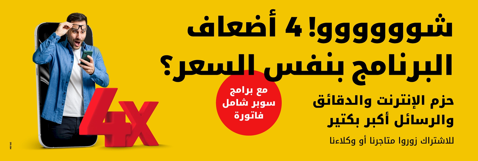 لمشتركي الفاتورة الأفراد الحاليين والجدد، اشترك في أحد برامج سوبر شامل أو جدد اشتراكك بالبرنامج الأعلى لبرنامجك الحالي لتحصل على 4 أضعاف مزايا البرنامج من حزم الإنترنت والدقائق والرسائل بنفس السعر والتي تتجدد مجانا لمدة 6 شهور.